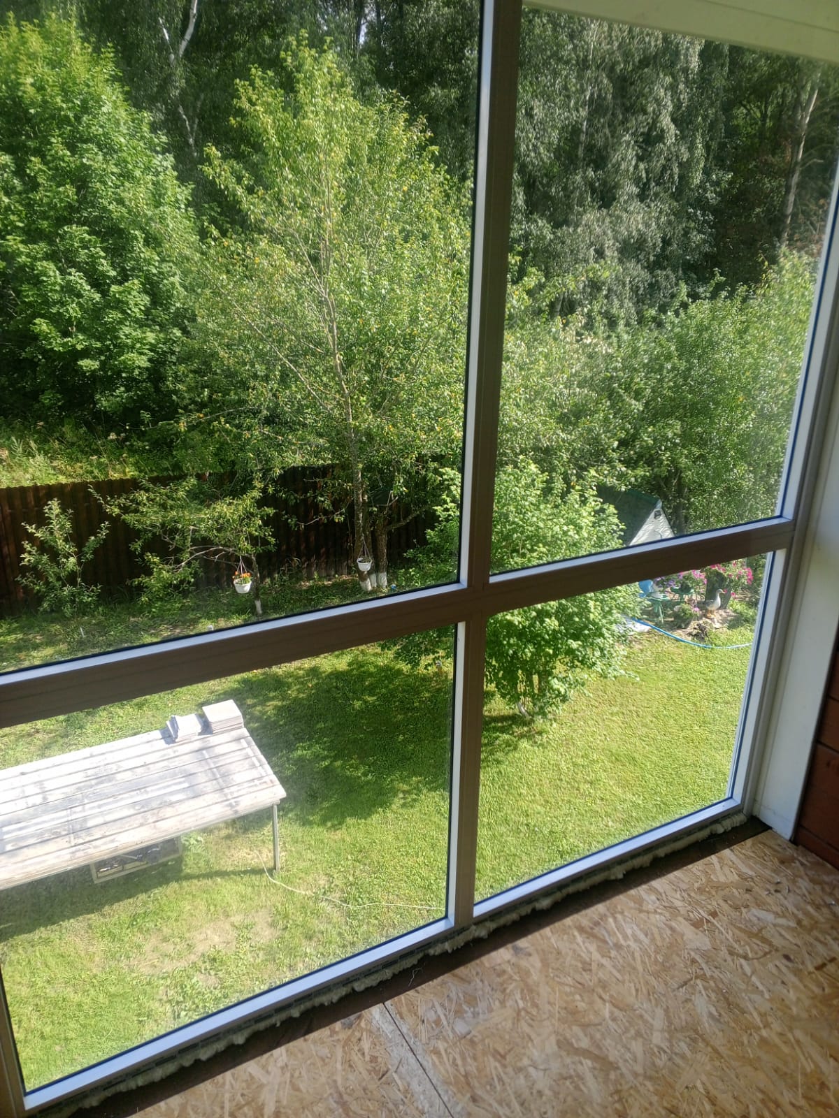 Установка остекления на балконе дачного дома из алюминиевого профиля с раздвижными створками.