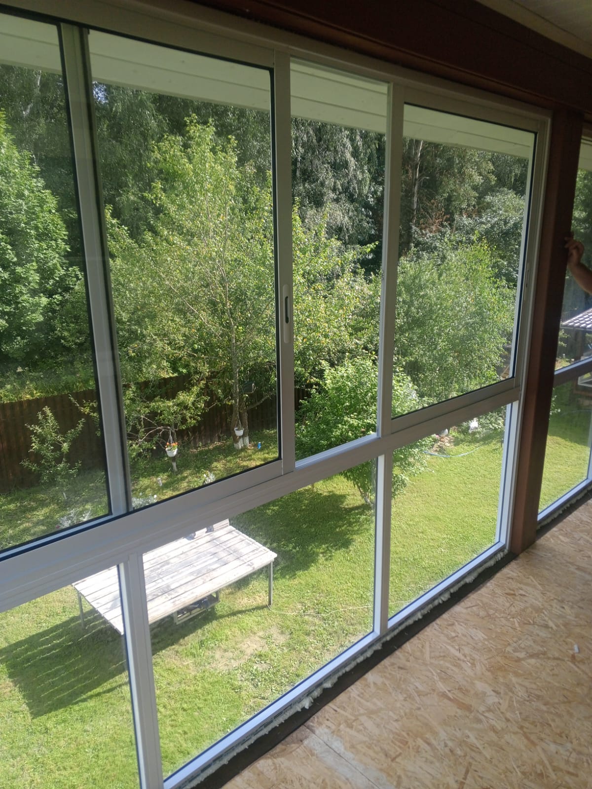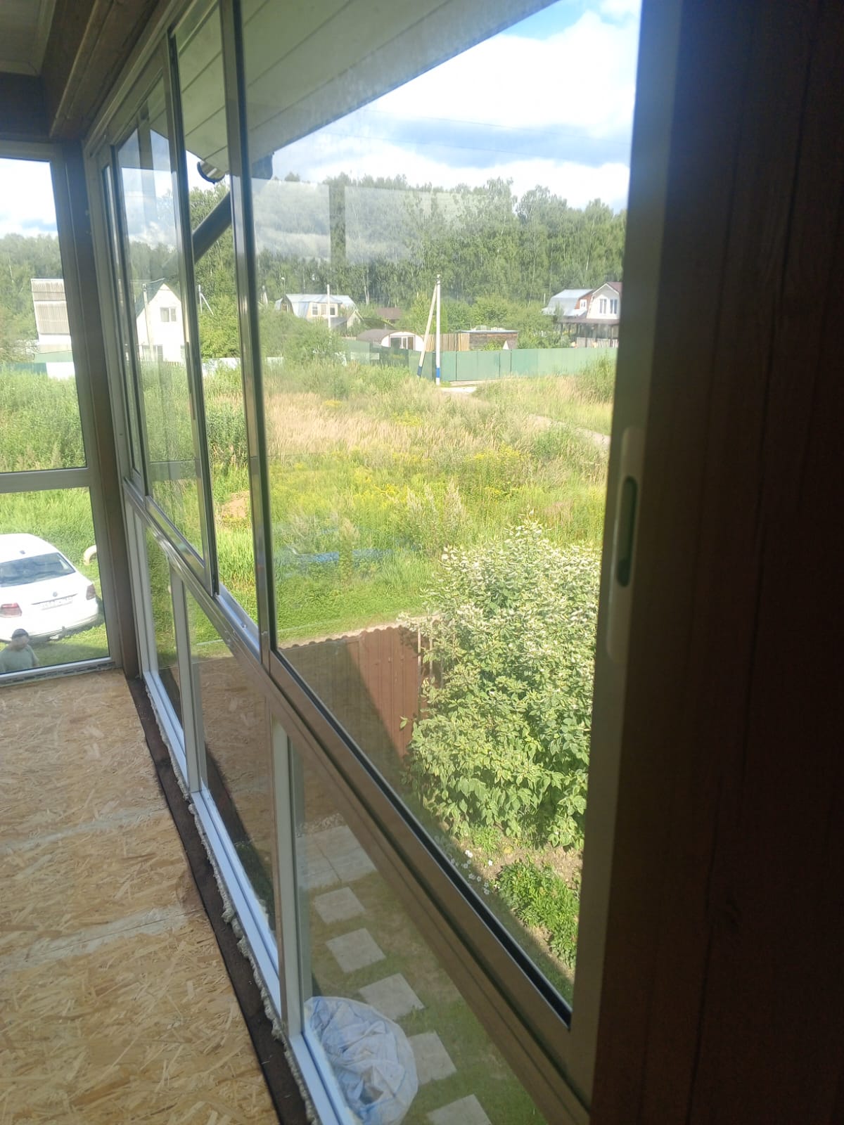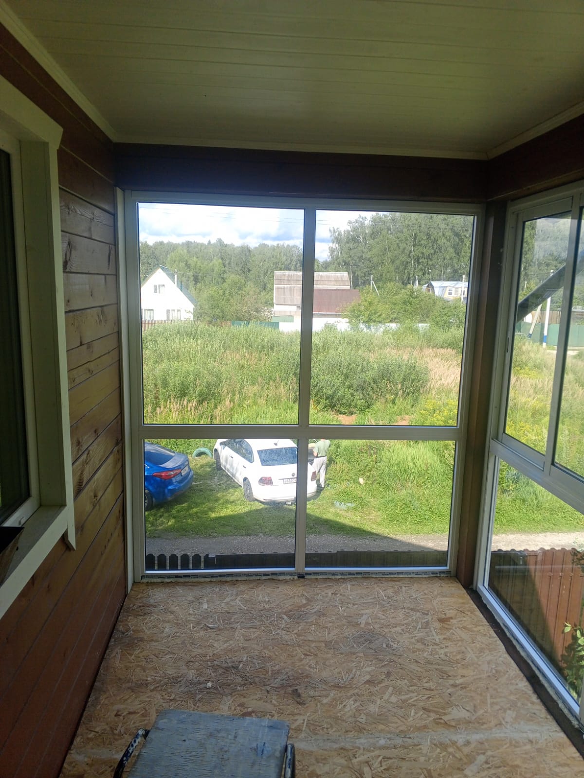 Установка остекления на балконе дачного дома из алюминиевого профиля с раздвижными створками.